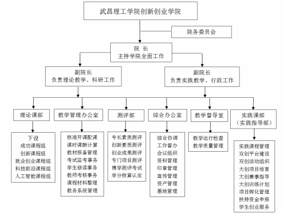 创新创业学院下设综合办公室、教学管理办公室、测评部、理论课部、实践课部(实践指导部)、教学督导室。